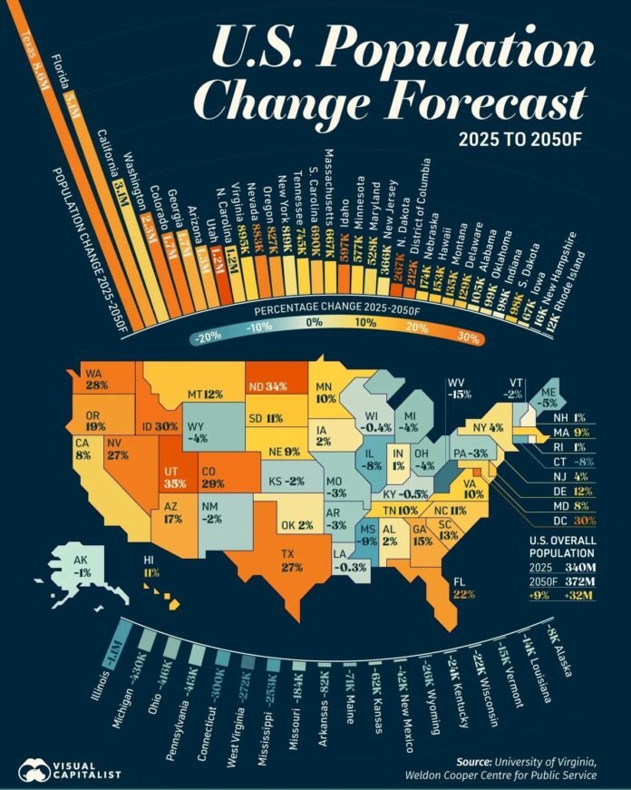 A graphic from Visual Capitalist’s Dorothy Neufeld illustrates America’s fastest-growing states by 2050, based on predictions from the University of Virginia.